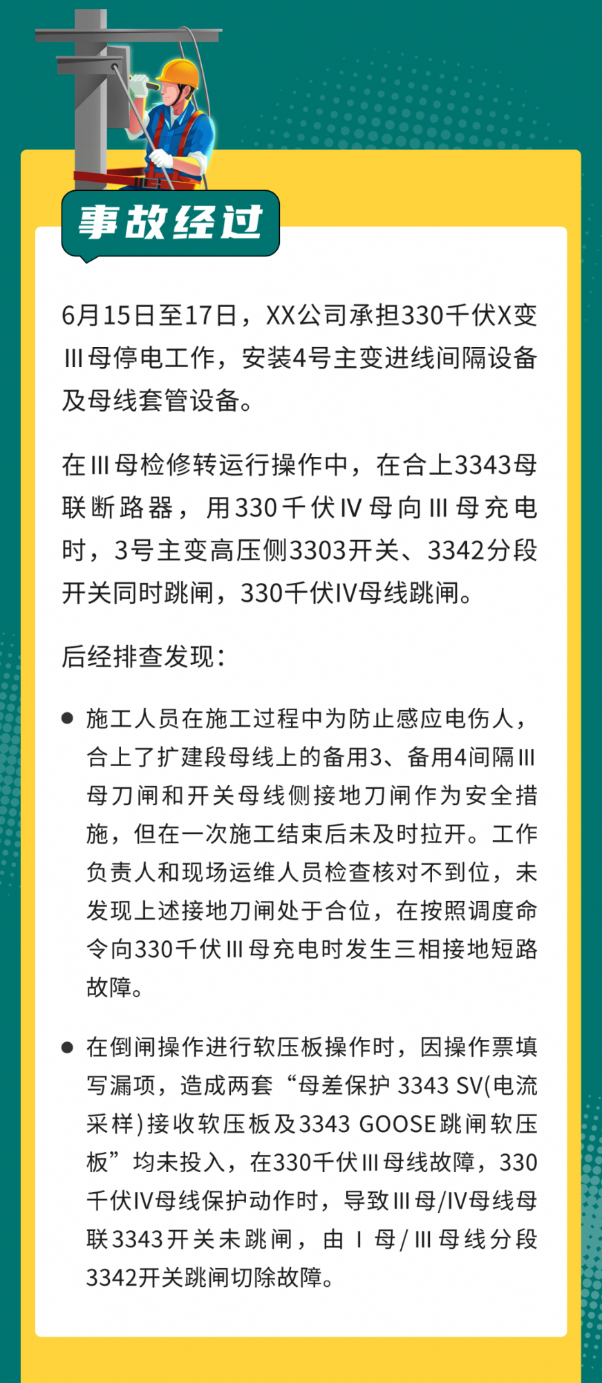 2018 年 6 月 16 日,某公司在 330kV 一變 330kV Ⅳ 母向 Ⅲ 母充電時(shí),因送變電公司備用間隔開關(guān)母線側(cè)接地刀閘未拉開漏項(xiàng)操作,造成 330kV Ⅲ、Ⅳ 母線跳閘。