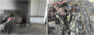 經(jīng)現(xiàn)場勘查得知,起火部位位于客廳西南角掃地機器人充電底座部位,起火原因系掃地機器人充電底座線路故障,引燃周邊可燃物引起火災(zāi)。