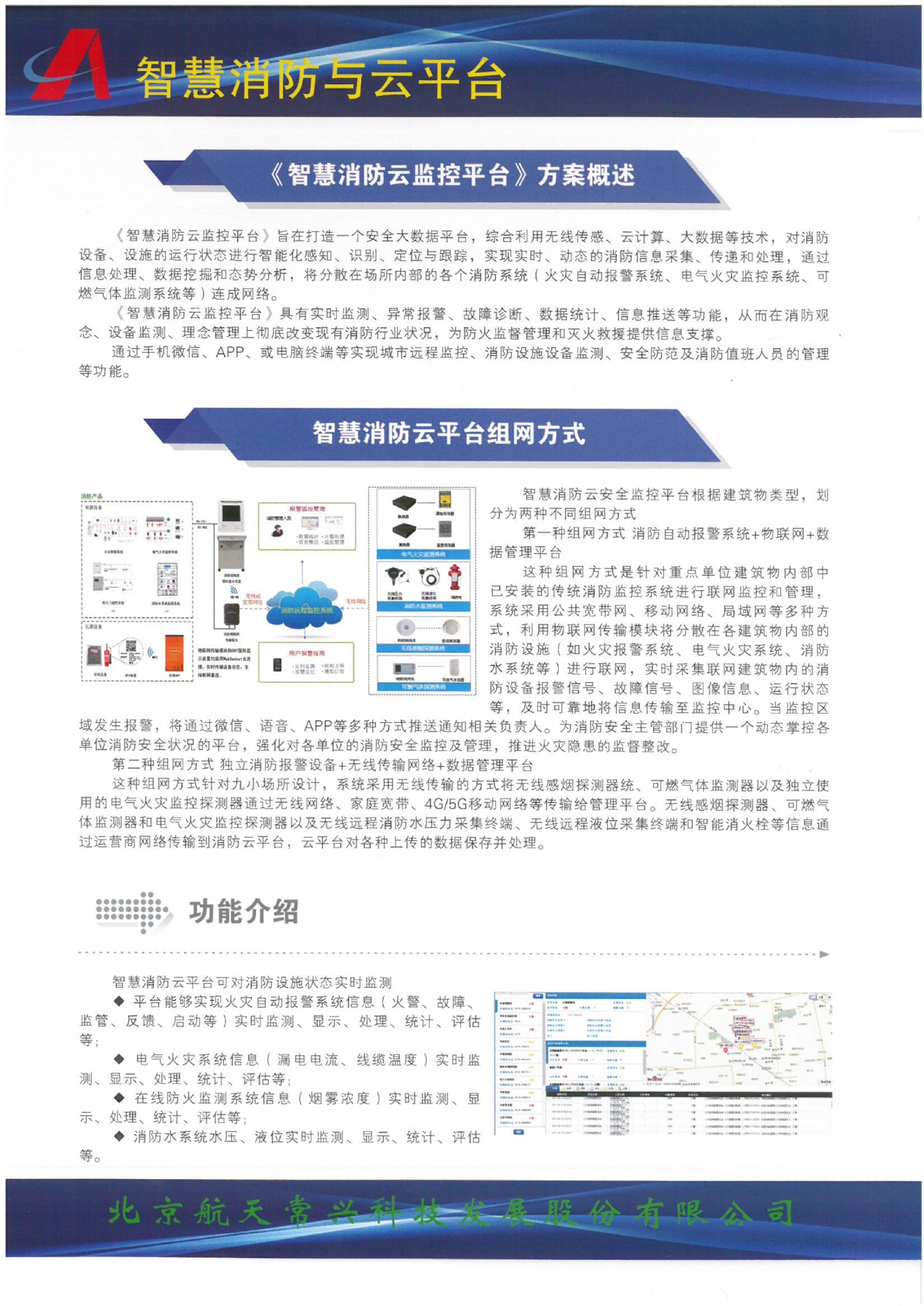 具有實時監測、異常報警、故障診斷、數據統計、數據分析、信息推送、自學習更新等功能,從而在消防觀念、設備監測及管理理念上徹底改變現有消防行業現狀,為防火監督管理、防患于未然和最終滅火救援提供強有力的信息支撐。